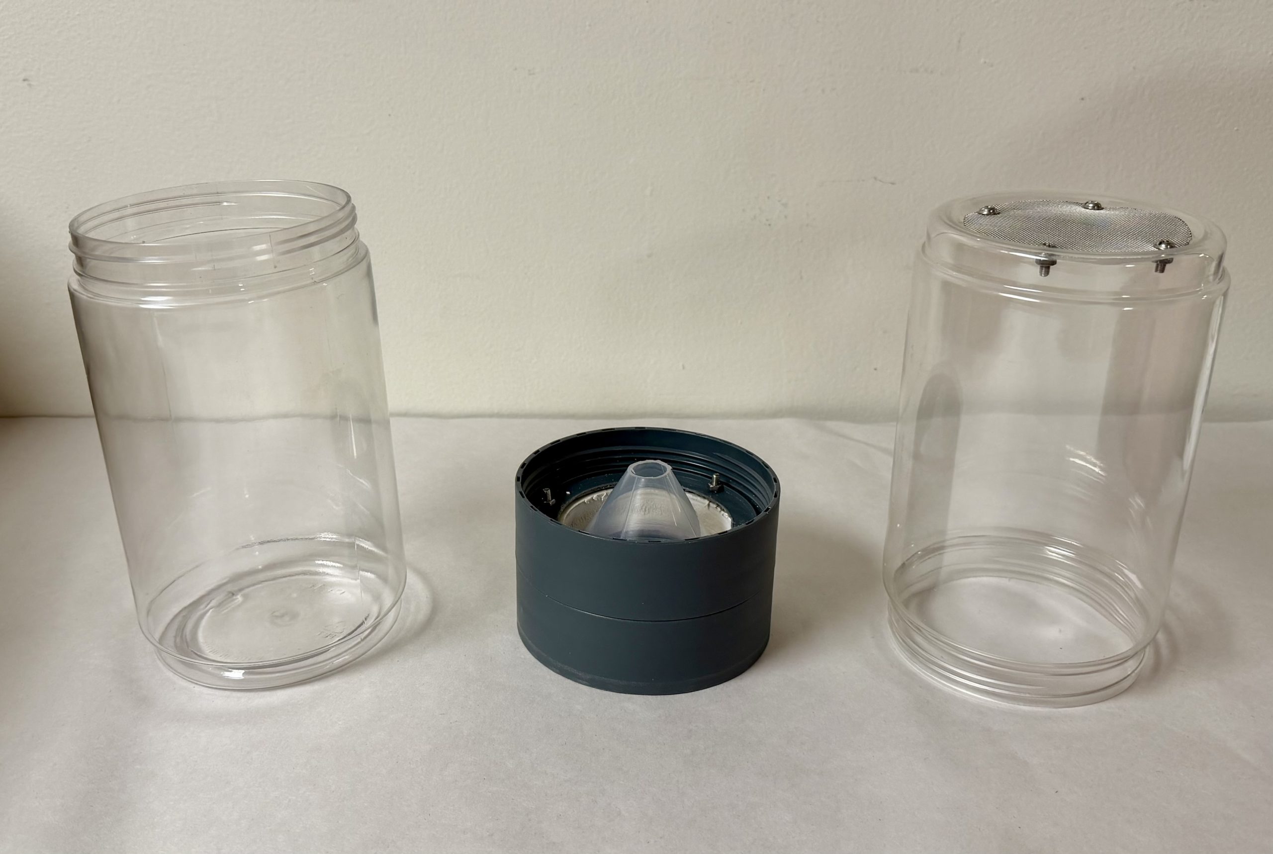 - The breeder consists of two plastic 2-liter jars that screw together. Between the two bottles is an inverted plastic cone that permits the movement of newly emerged adult mosquitoes from the lower aquatic chamber into the upper resting chamber.